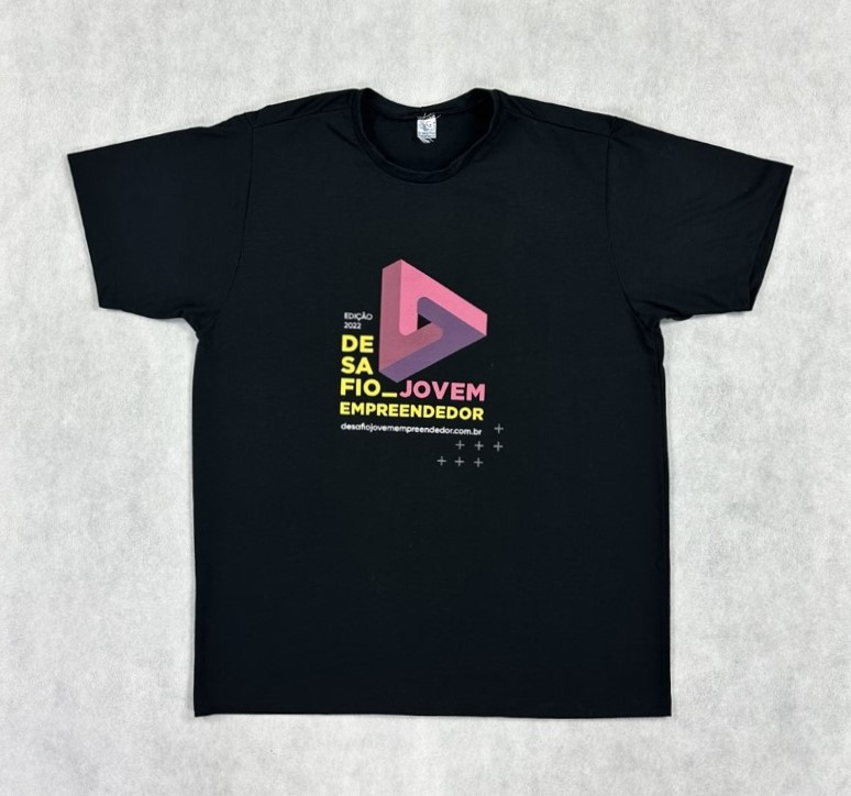 Camiseta confeccionada em malha, na cor preta, traz estampado na frente a marca do Desafio Jovem Empreendedor, o ano de edição e o site do programa. Nas costas traz a frase "A experiência que transforma o seu futuro" e a logo Sebrae.