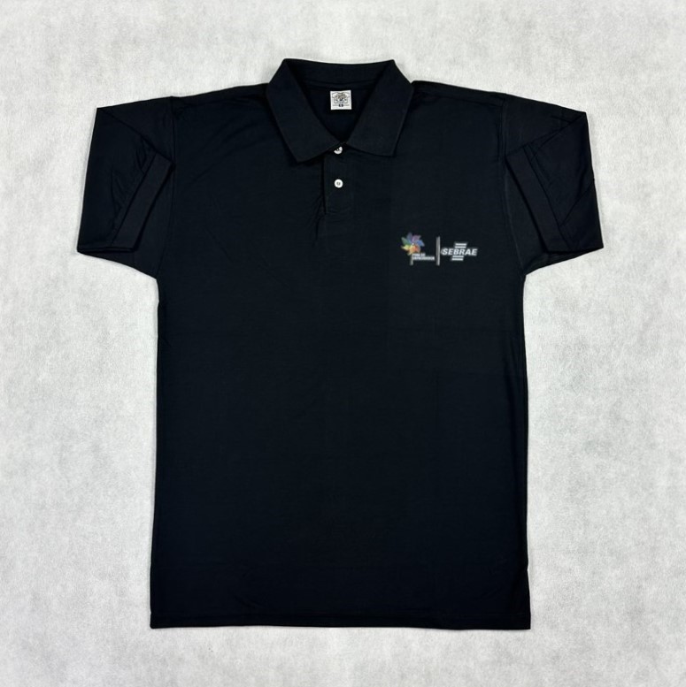 Camiseta confeccionada em malha, modelo polo, na cor preta, traz no lado superior esquerdo o catavento, marca da Feira do empreendedor e a logomarca do Sebrae.